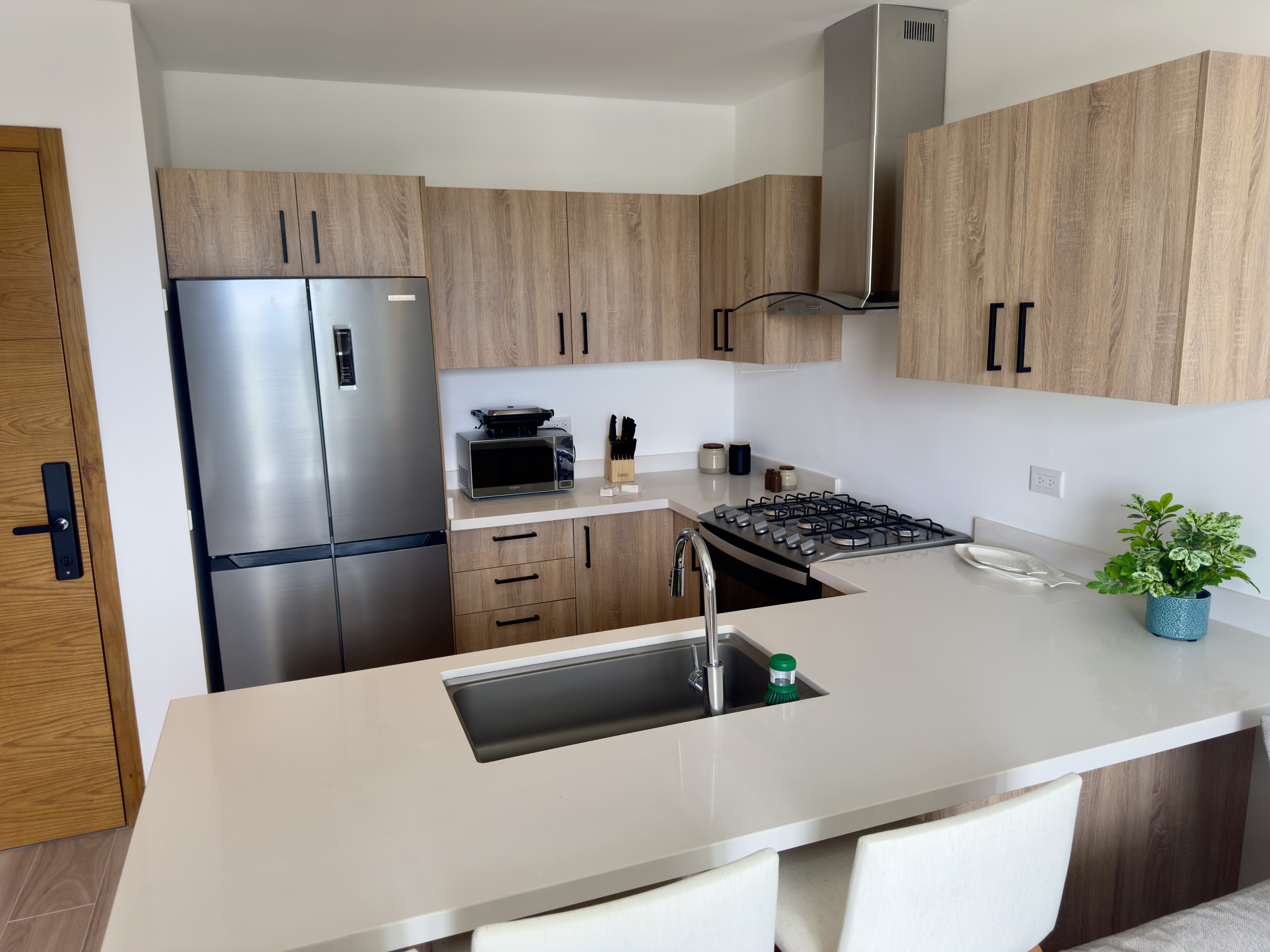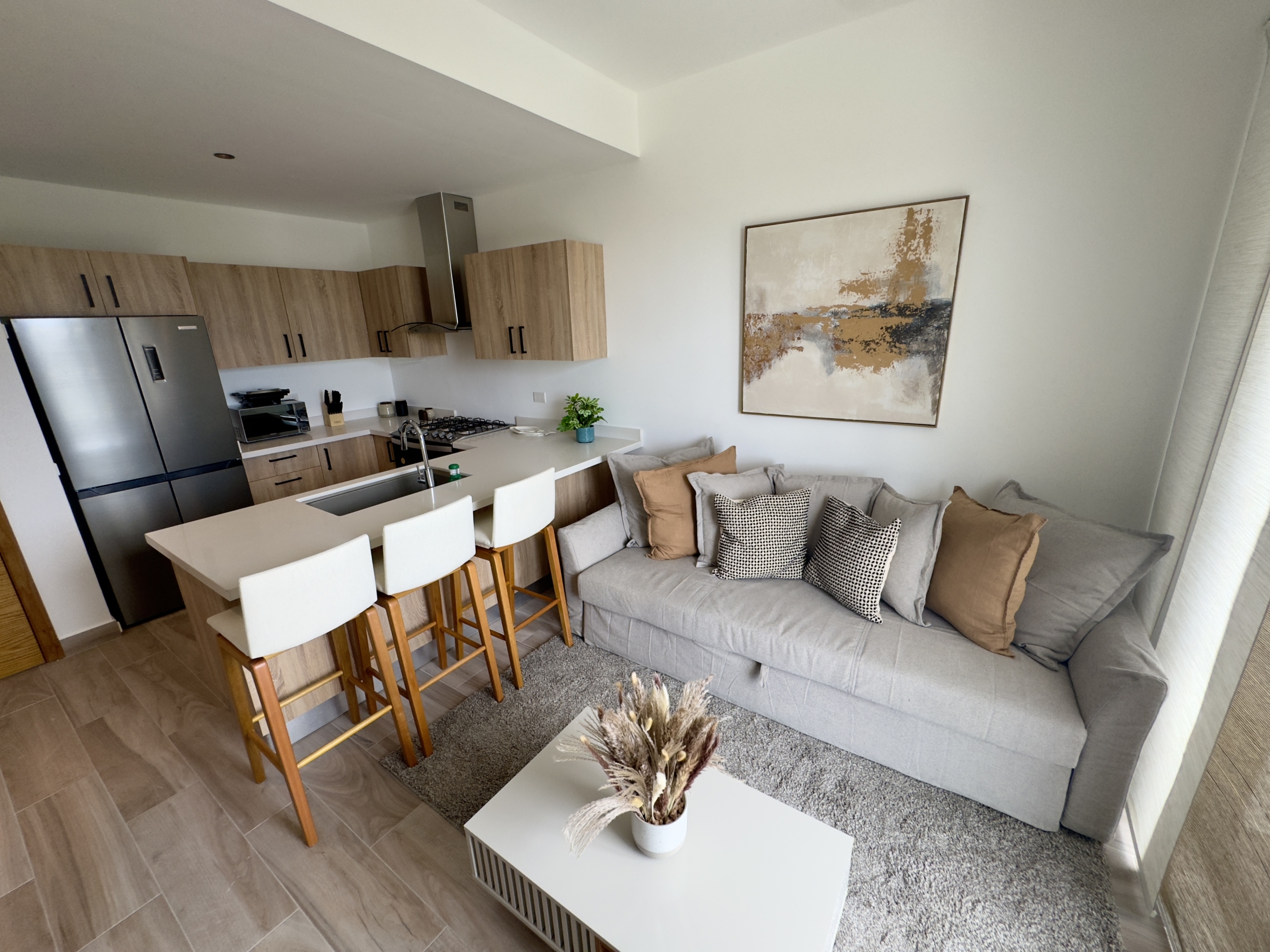 La unidad viene completamente amueblada, presentando una distribución funcional y acabados de calidad con cerámica, madera pulida, vidrio y concreto para un ambiente moderno y acogedor.